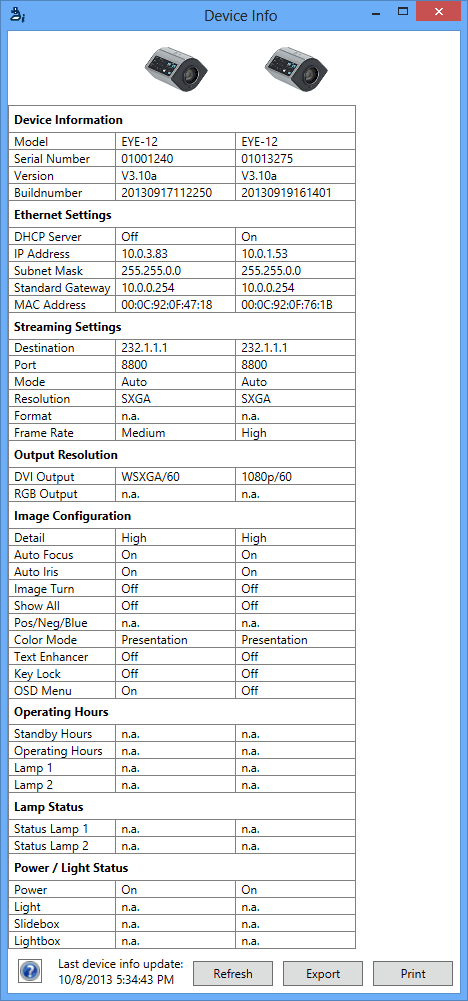 With Device Information you will get a quick overview of current Visualizer settings. The available information depends on selected Visualizer model and installed firmware version. note
