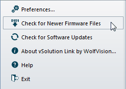 To ensure that you always use the latest firmware files for updates, please enable the setting "Check for newer firmware files on application startup" in the "Preferences" dialog box for an automatic update check every time the application is started (Internet access required to connect to WolfVision's web server). When an update is available you will get asked if you want to download the newer version(s).