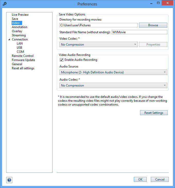 On this tab you can define the default directory and file name for saving movie files. Another option to choose is the codec (video compressor) which is used to create the movie. To use the audio function, a separate microphone is necessary.